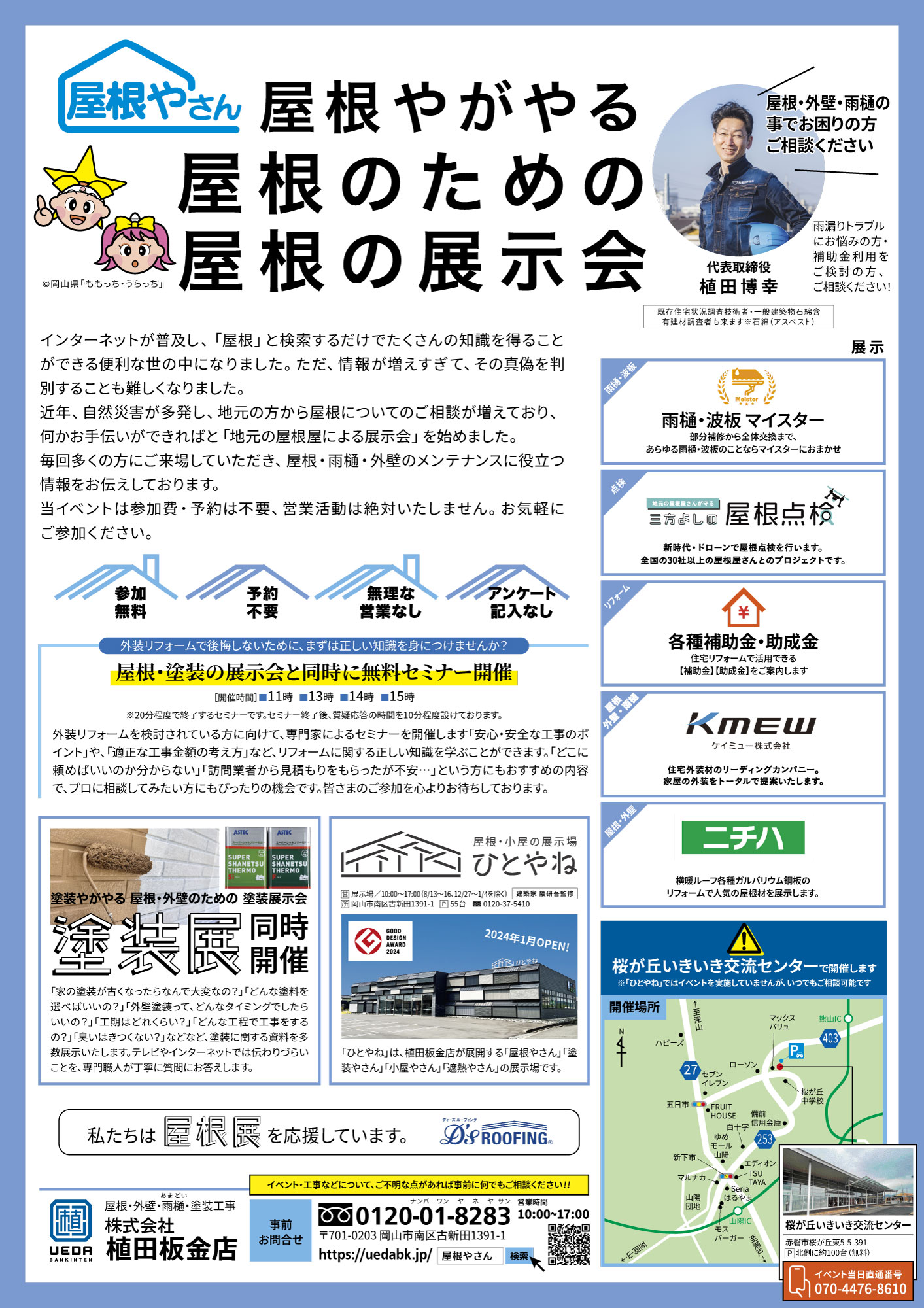 近年、自然災害が多発し、地元の方から屋根のことでご相談が増えており、何かお手伝いができないかと思い、「地元の屋根屋がやる屋根の展示会」を開催しました。屋根・雨樋・外壁のメンテナンスに役立つ情報をお伝えします。当イベントは参加費・予約は不要です。営業活動は絶対いたしません。お気軽にご相談ください。