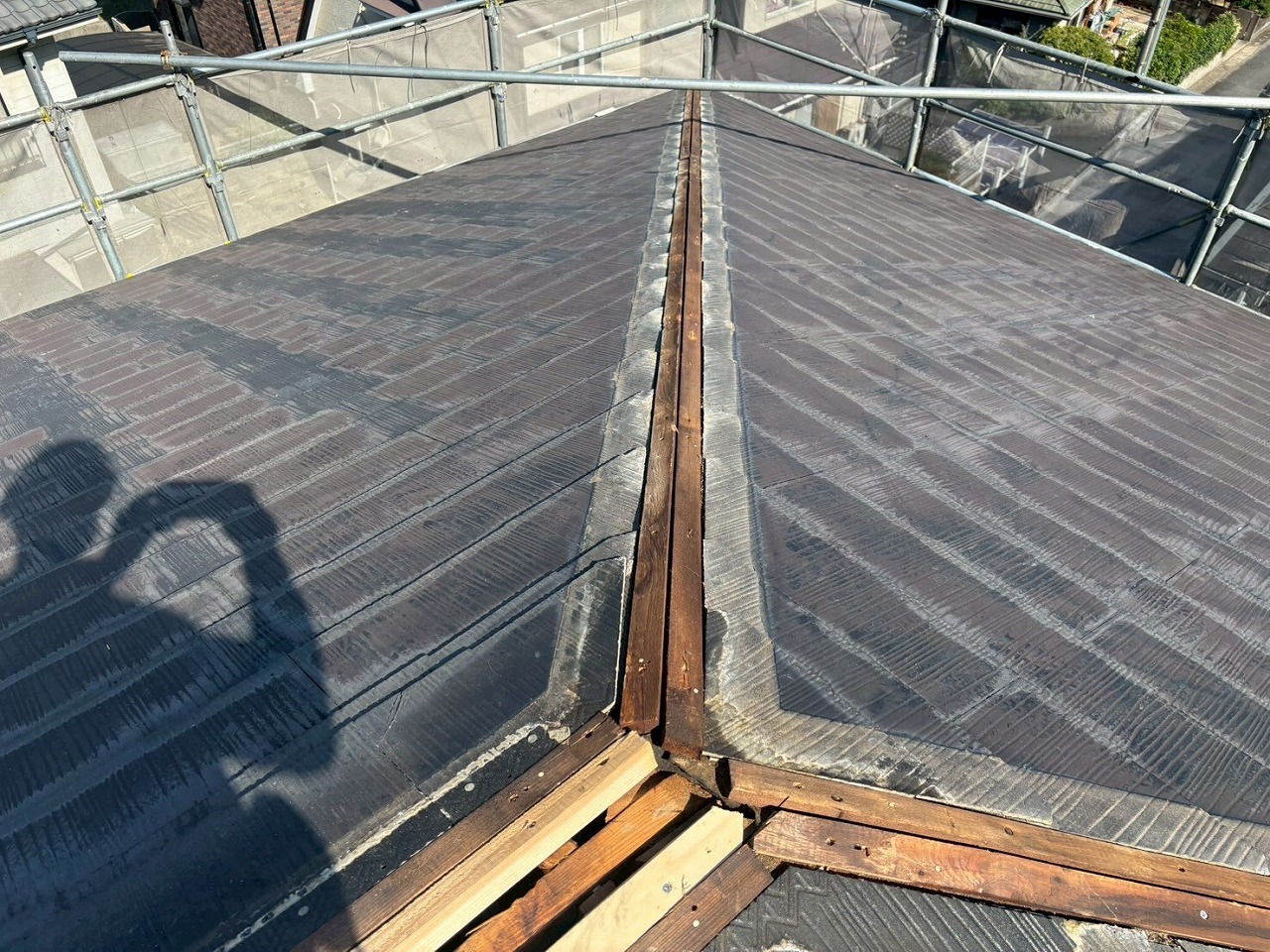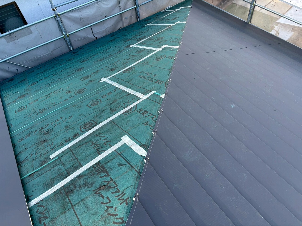 今回は千鳥葺きで施工していきますので、ジョイントを入れています。ジョイントなしでの施工も可能ですが、一枚が非常に長くなりますので運搬・荷揚げが可能か注意が必要です。