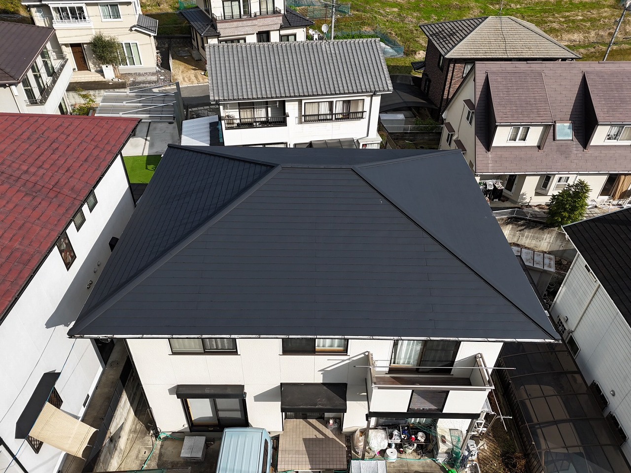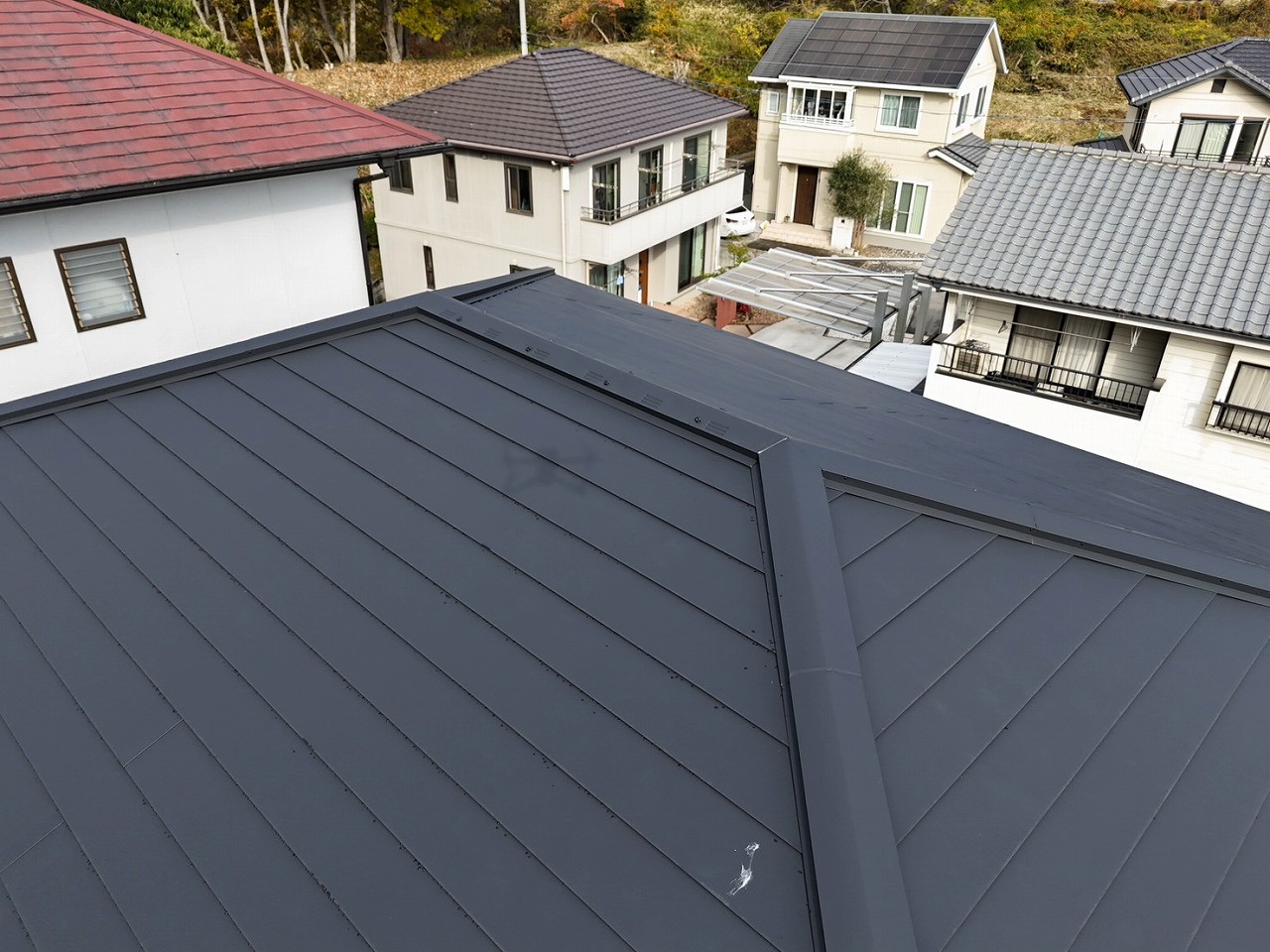 屋根材の色をブラックを選ばれましたので、落ち着きのある引き締まった印象になりました。付帯部も黒色ですので、とても家全体がまとまって見えます。