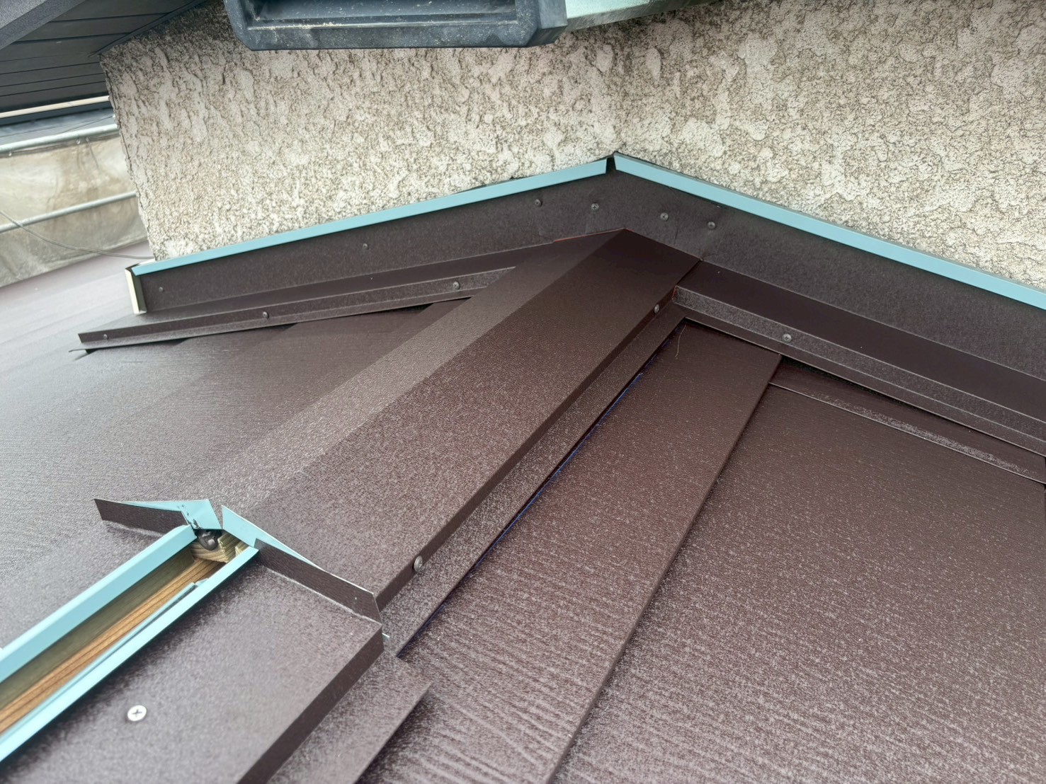 屋根材の重ね部分やジョイント部分は水の侵入の恐れがありますので、コーキング処理等を適切に行い、水の侵入経路を遮断します。