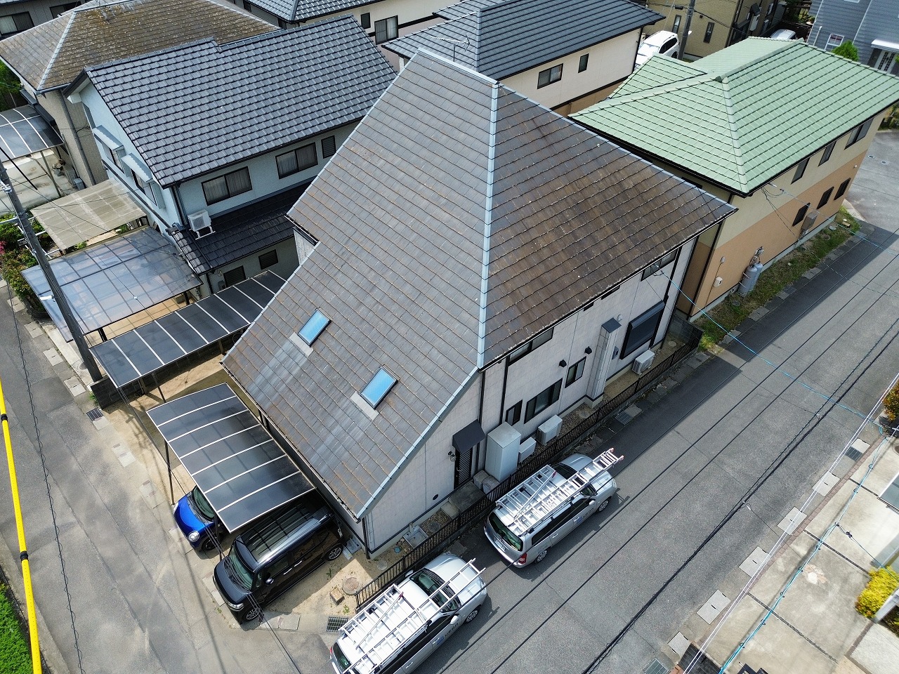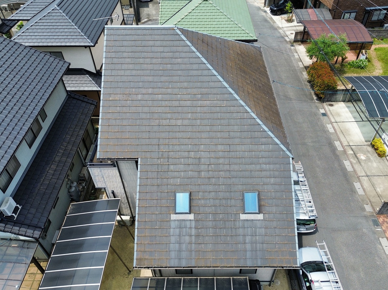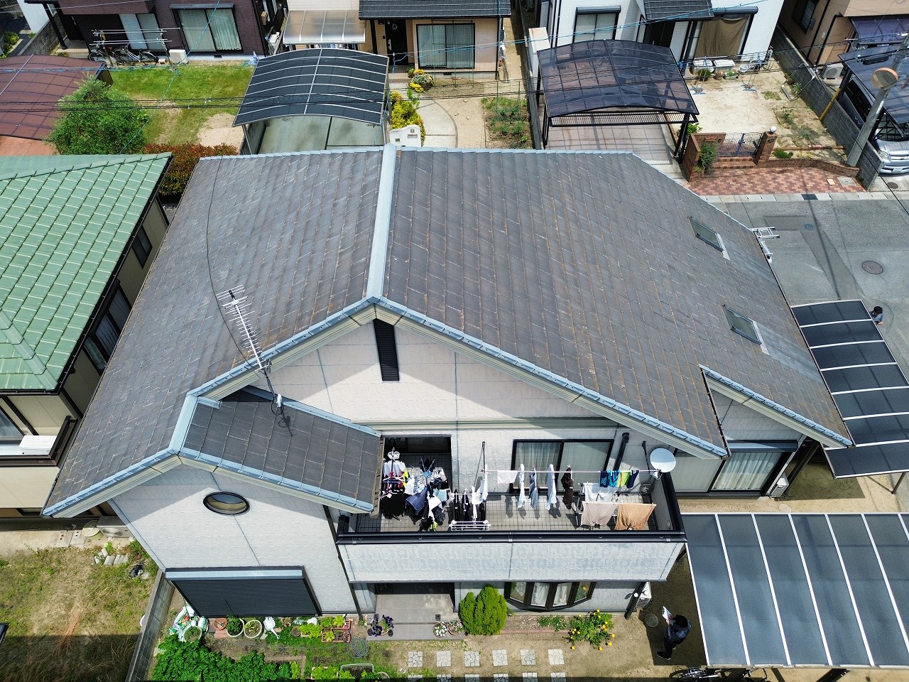 今回のお住まいは急勾配の屋根だったため、安全面を考慮しドローンを使用して屋根全体を確認しました。