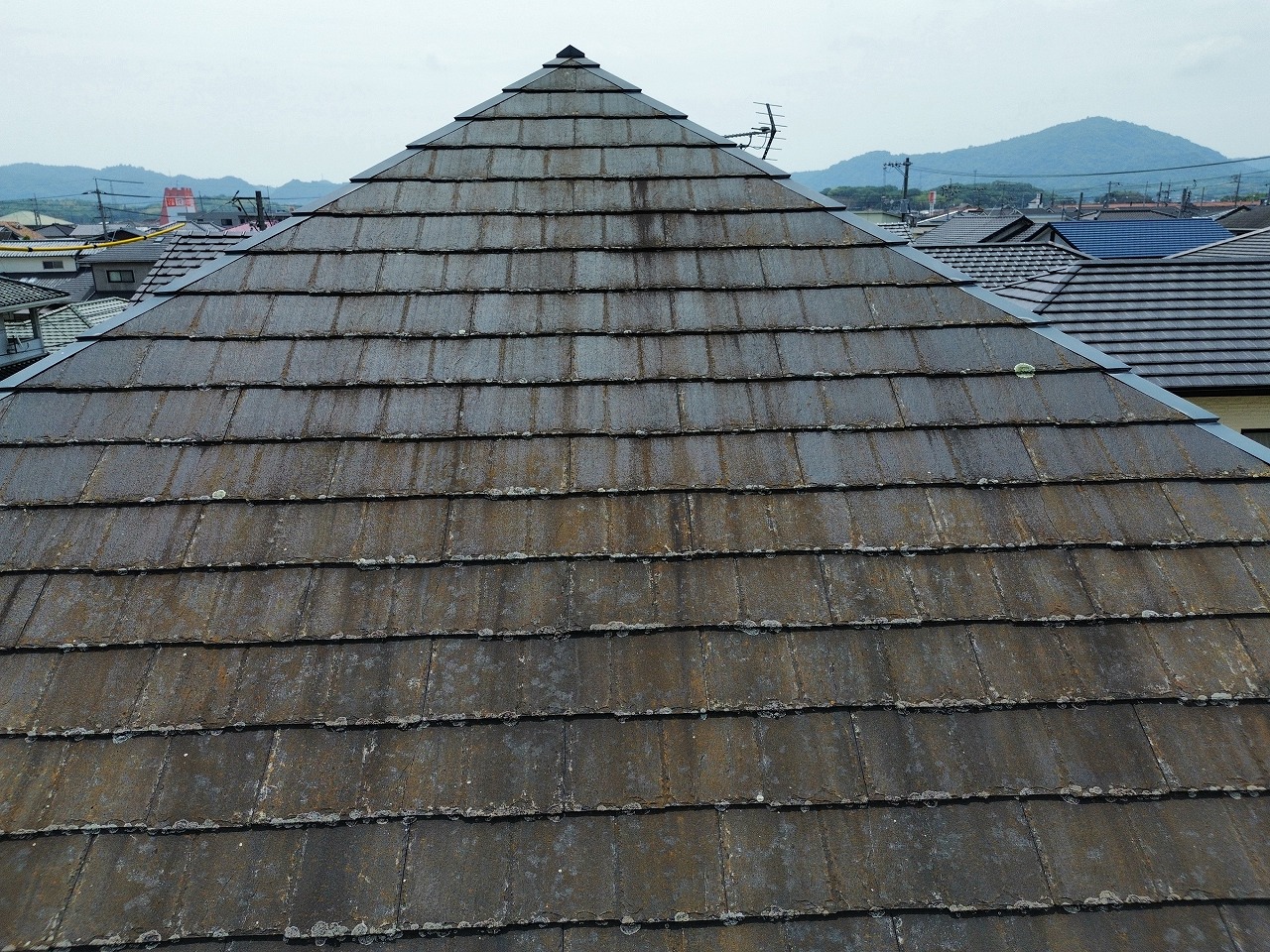ドローン調査では、広範囲の色褪せ、コケの繁殖、カビの発生、スレートの割れ、端部の欠け等が確認できました。