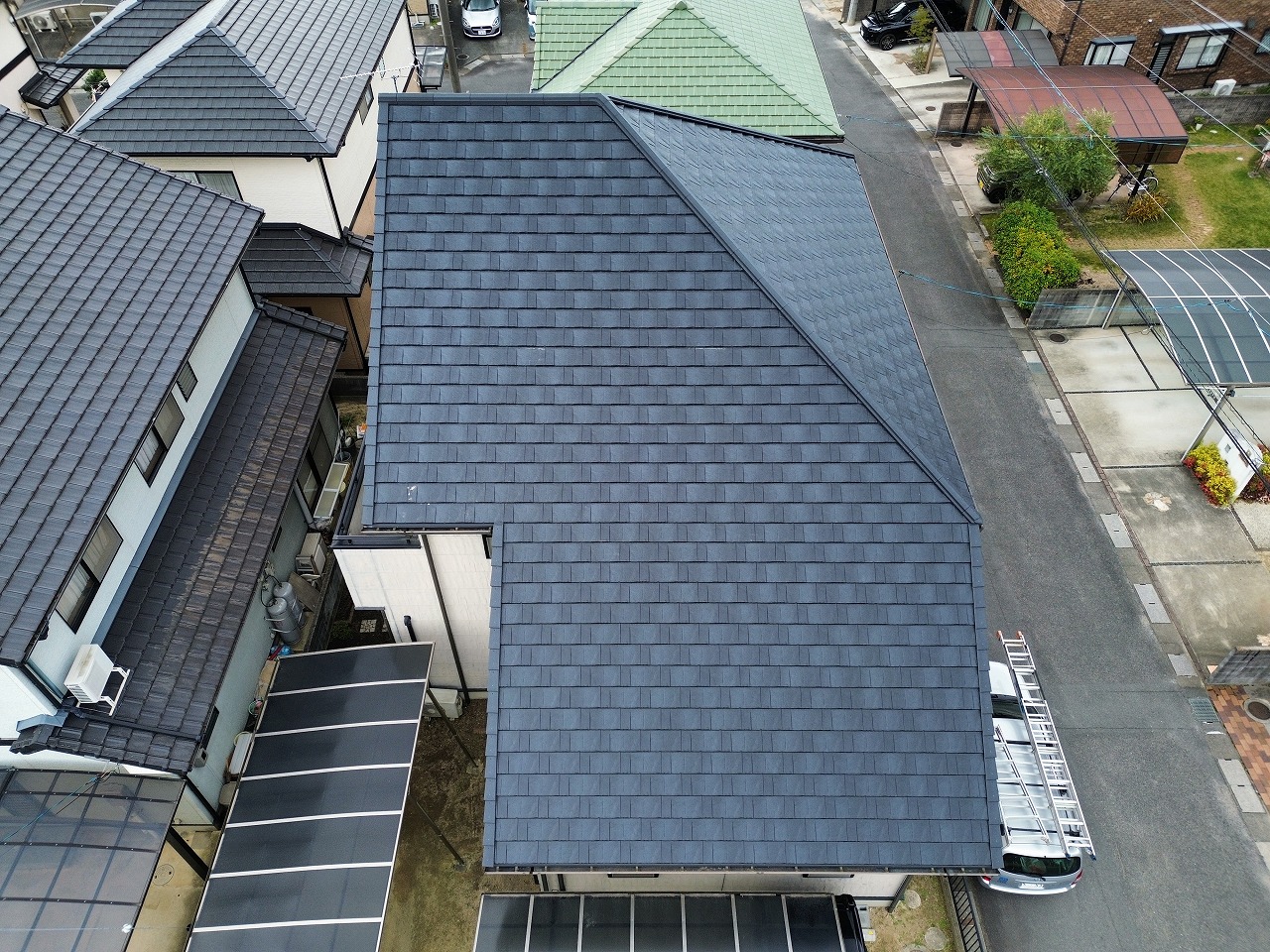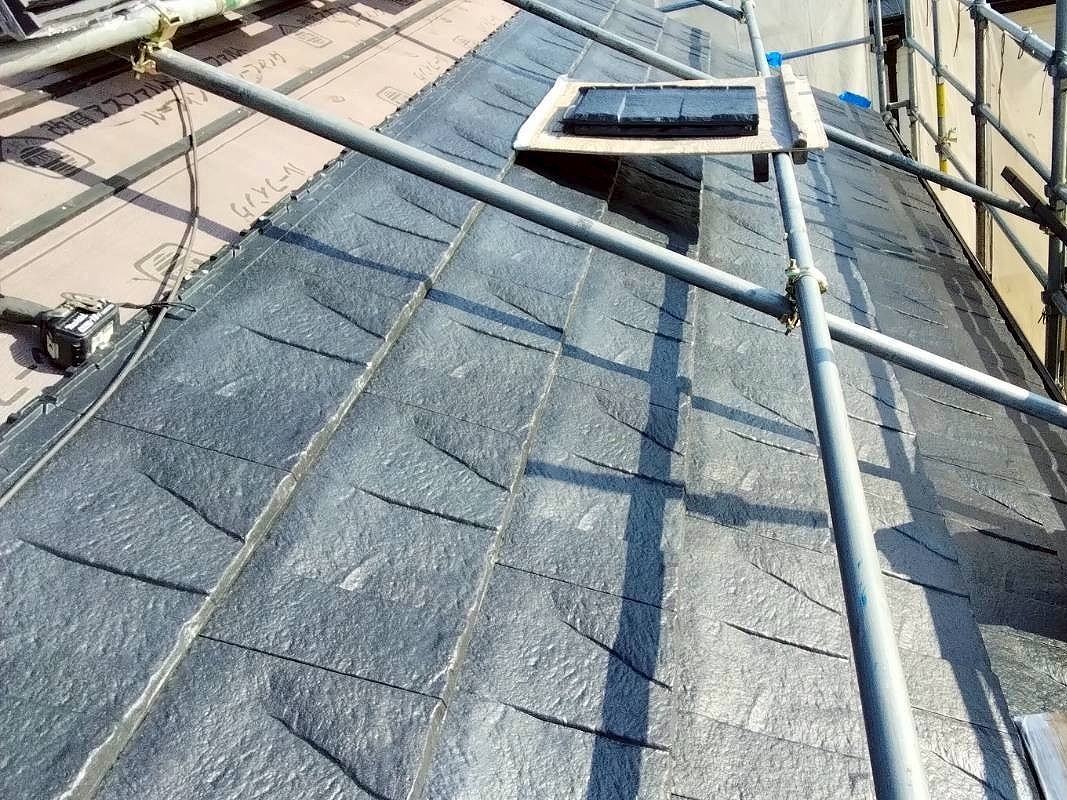 総社市にて、既存のスレート屋根からルーガ鉄平への葺き替え工事を行いました。