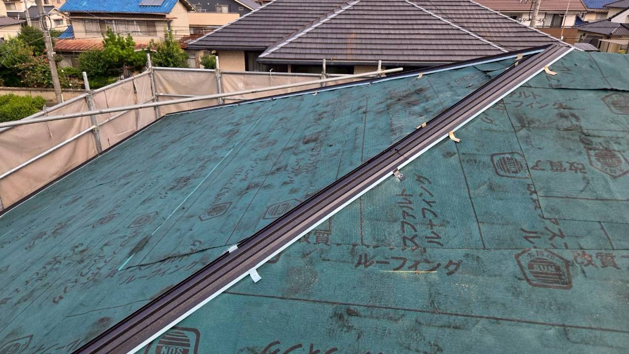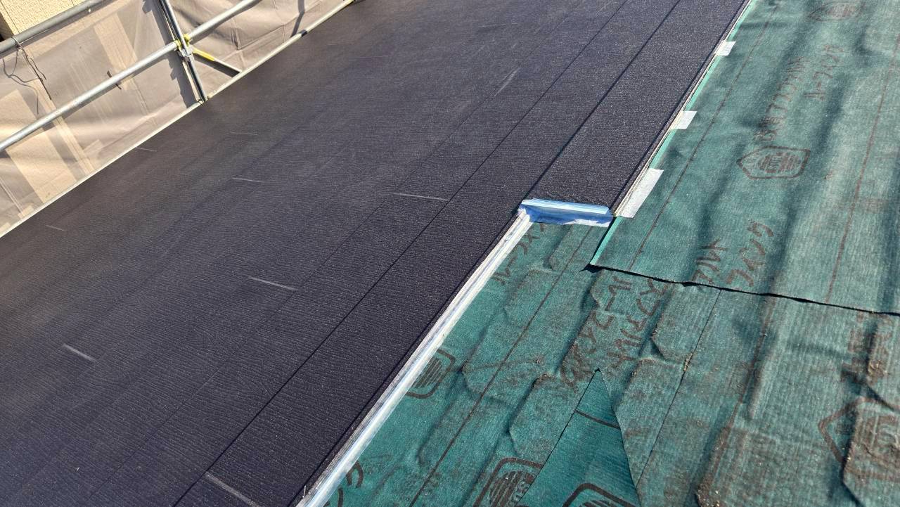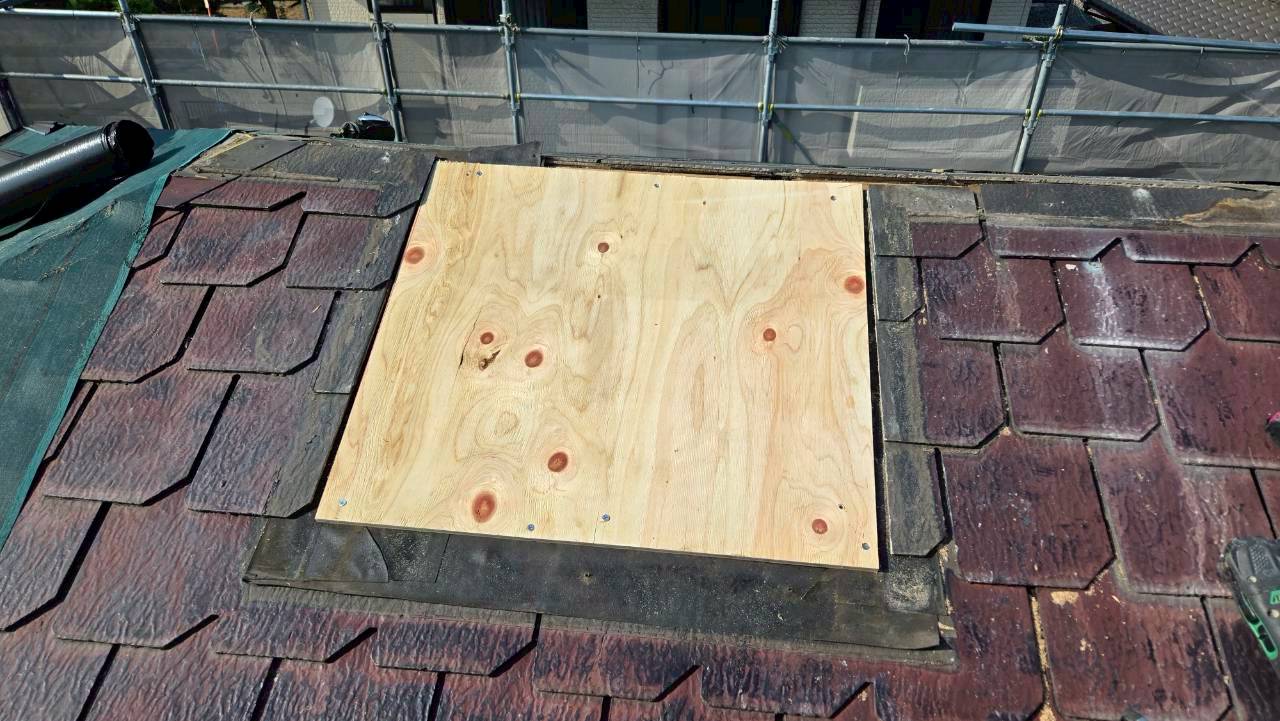 写真は煙突を撤去し、役物とルーフィング(防水シート)をつけているところです。